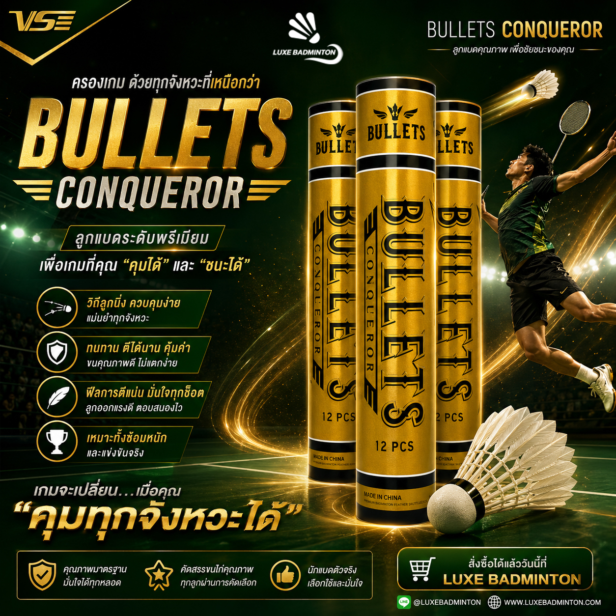 ในเกมแบดมินตัน “จังหวะ” คือทุกอย่าง และการเลือกใช้ลูกแบดที่ดีสามารถเปลี่ยนผลการแข่งขันได้ทันที Bullets Conqueror ถูกออกแบบมาเพื่อผู้เล่นที่ต้องการมากกว่าความธรรมดา ให้คุณควบคุมเกมได้ดั่งใจ พร้อมสร้างความได้เปรียบในทุกช็อต